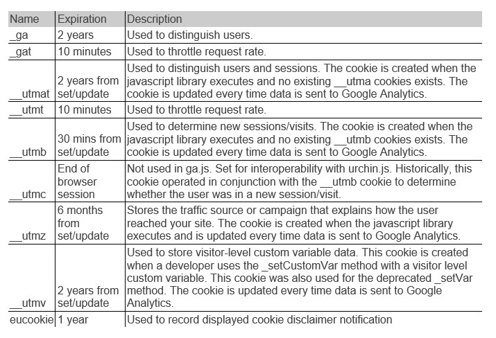 You can find more information about the individual cookies we use and the purposes for which we use them in the table below: